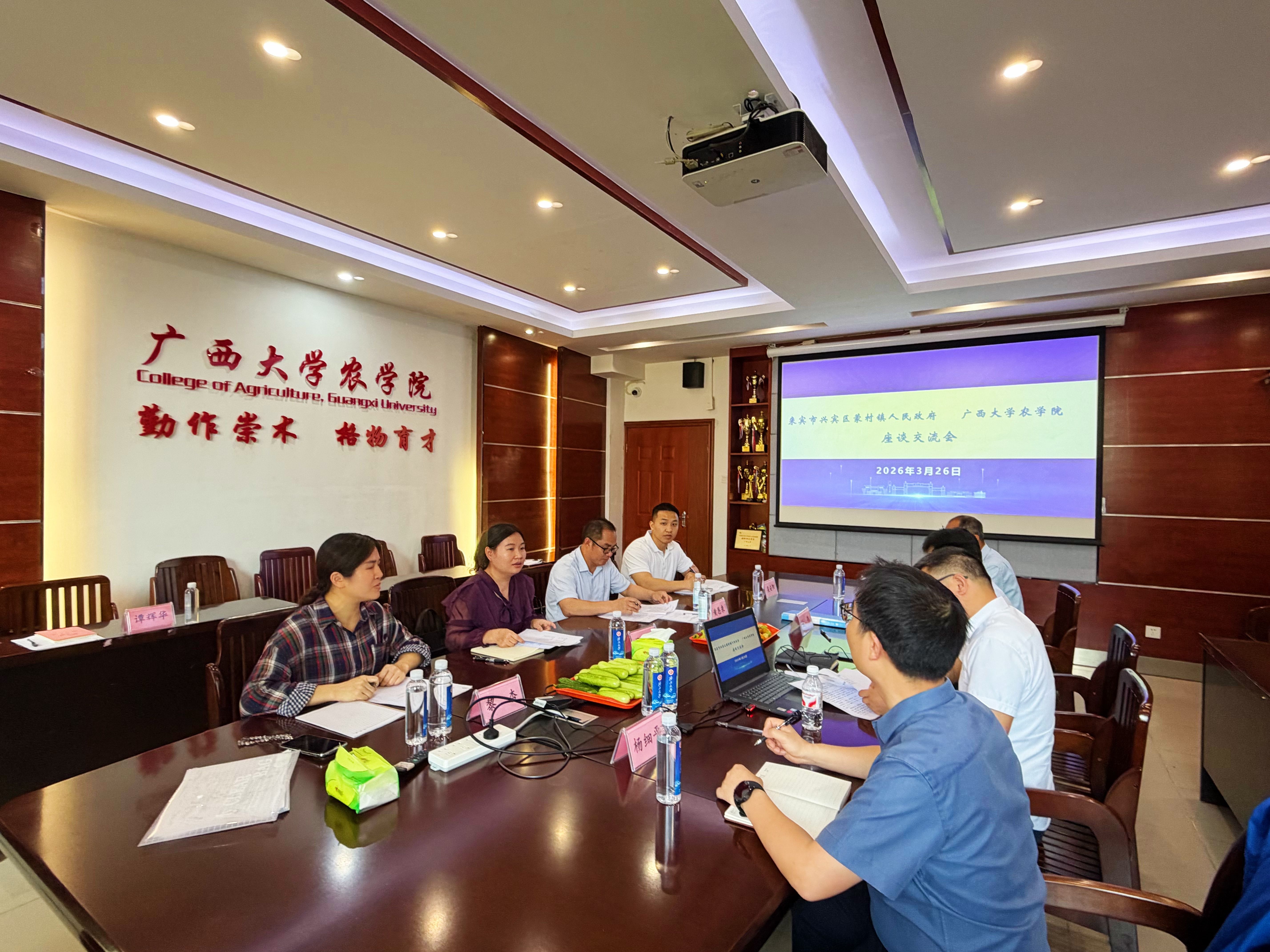 3 月 26 日下午,学院召开产学研合作座谈会,与到访的来宾市兴宾区蒙村镇人民政府党委副书记、镇长吴思娜一行,围绕合作开展农业科技创新、成果转化、人才培养等方面进行深入交流,共商乡村振兴与农业高质量发展新路径。院长张积森、副院长姚伟、农学系主任杨细平、园艺系副教授唐小付等出席座谈会。