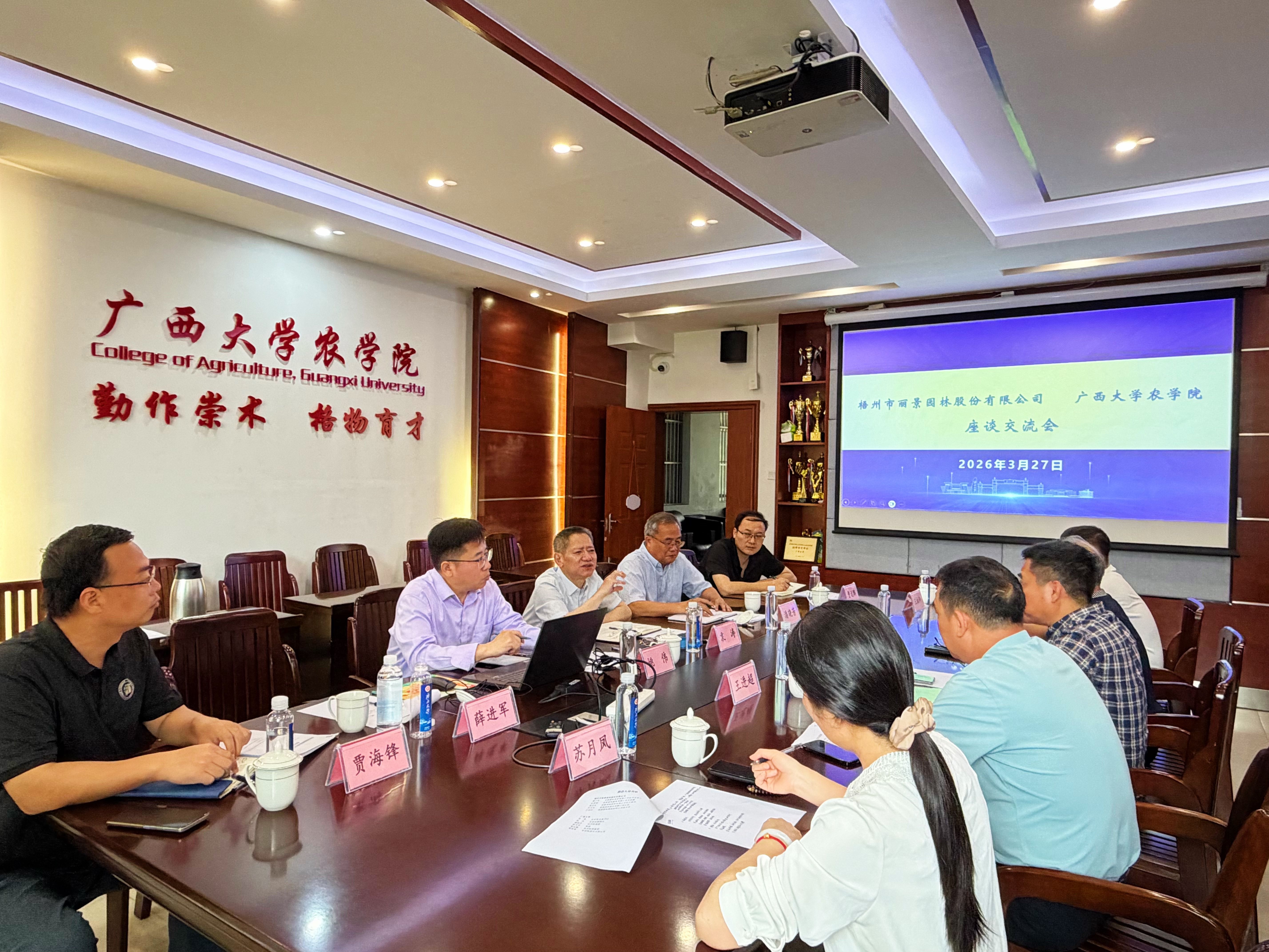 3 月 27 日下午,梧州市丽景园林股份有限公司与我院召开校企合作座谈会。双方聚焦校企深度合作、香花油茶技术研发与应用两大核心,以产学研融合为纽带,探索资源共享、优势互补的合作模式。座谈会由学院党委书记袁涛主持,伟德国际victor1946及林学院骨干教师共同参会。