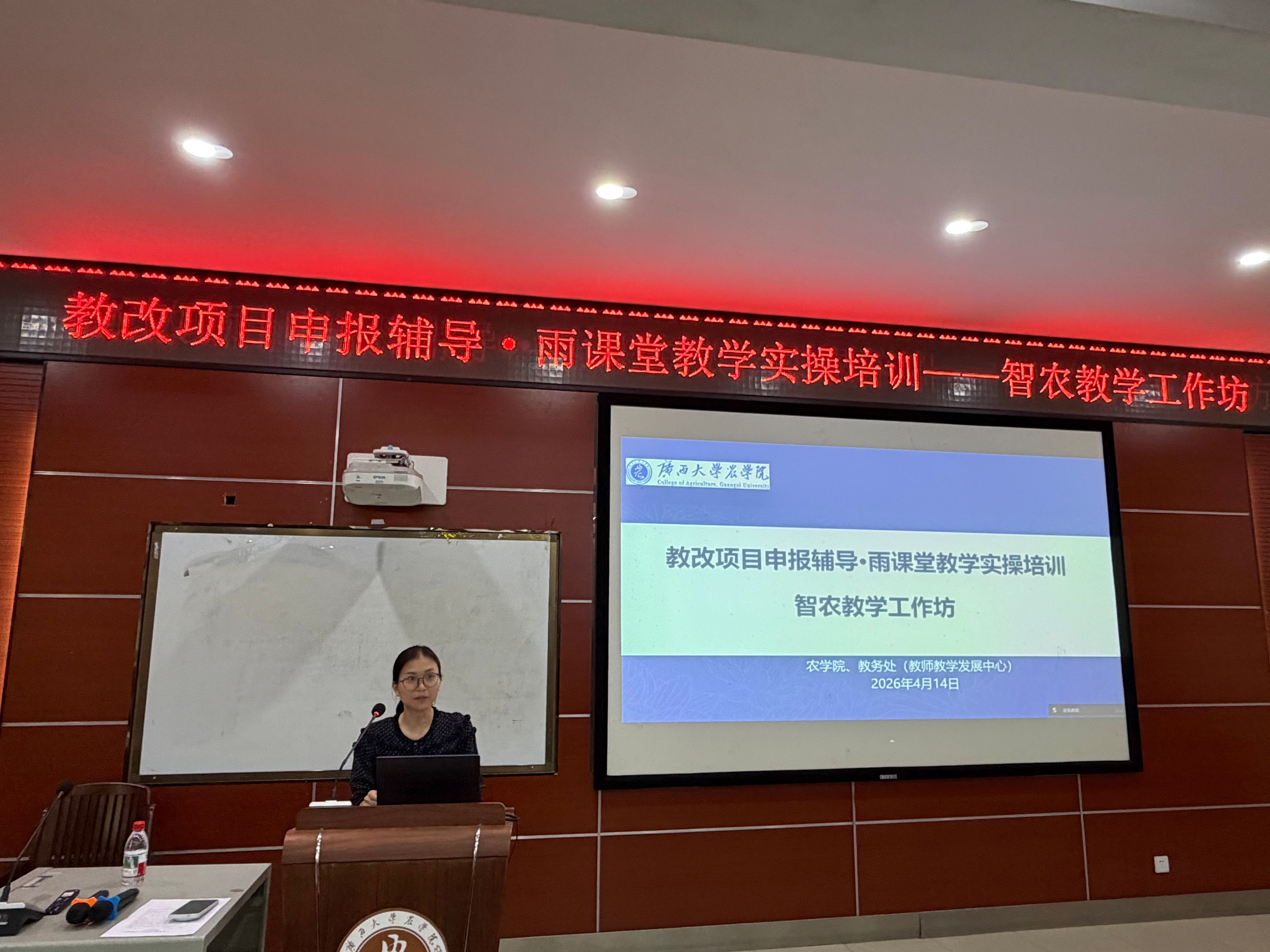 为深入推进教育教学改革,助力教师提升教改项目申报能力与数字化教学水平,4 月 14 日上午,伟德国际victor1946联合教务处(教师教学发展中心),在学院 306 报告厅成功举办 “教改项目申报辅导・雨课堂教学实操培训” 智农教学工作坊。本次工作坊由学院副院长韦燕燕主持,党委书记袁涛出席,学院AI 课程建设项目团队成员及热衷教学改革的一线教师齐聚一堂,共学教改新思路、共探智慧教学新方法。