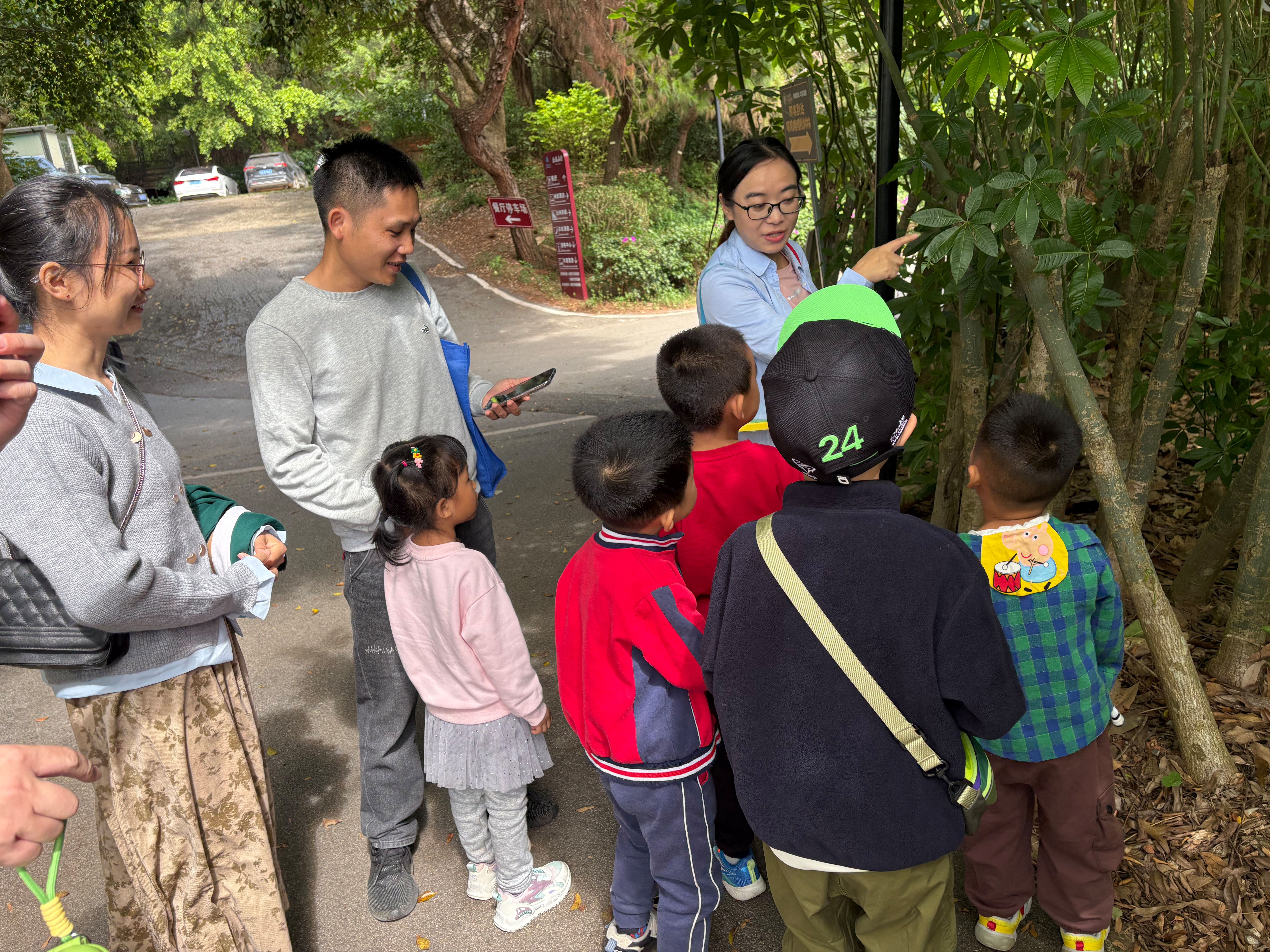 教职工们卸下工作的疲惫,或结伴漫步于林间步道,欣赏秋日里的斑斓景致,听鸟鸣虫唱;或围坐一起,分享日常工作趣事与生活感悟,阵阵欢声笑语回荡在庄园上空,热闹而温馨。还有教师充分发挥专业优势,化身“自然导师”,教同行的小朋友们教小朋友们认昆虫、识植物,让孩子们近距离感受了农业科学的魅力,也让教职工在亲子互动中收获了别样的快乐。