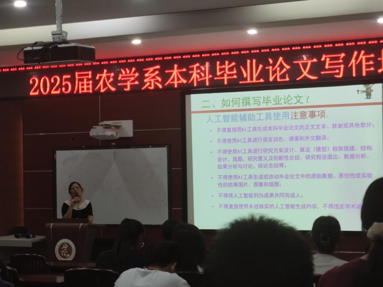 图/韩岩松,文/韦茂贵 4月25日下午,为进一步提高我院本科毕业论文环节的教学质量,确保2025届本科生高质量地完成毕业论文,根据学校及学院工作安排,农学系组织2025届本科毕业生,在学院306会议室举行2025届本科毕业论文写作培训会。本次会议由农学系副主任韦茂贵担任培训教师,从“毕业论文普遍存在的问题”和“如何撰写毕业论文”两方面详细阐述了毕业论文撰写方法及注意事项。最后,韦老师还就毕业季其他重要事项的进度安排及注意事项一一告知,为农学系本科毕业生的顺利毕业提供指导。