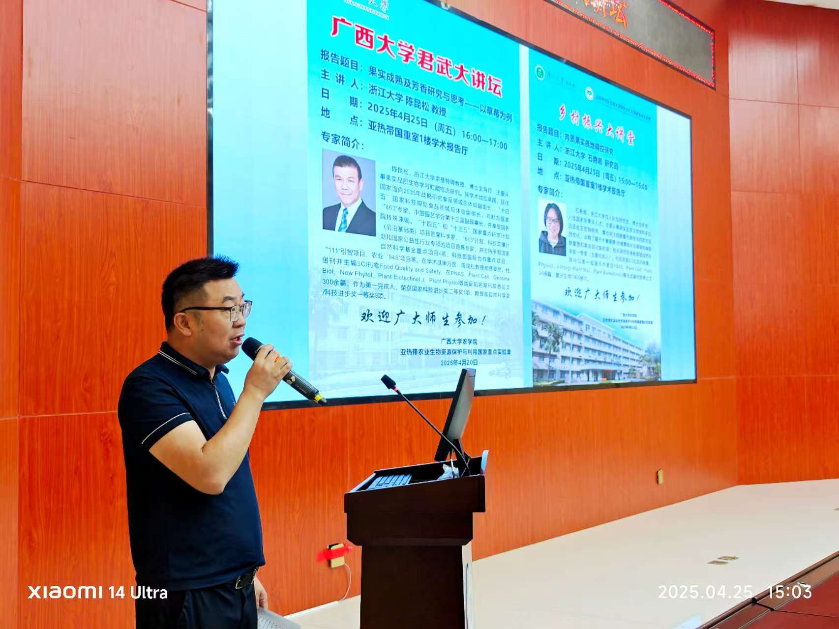 4月25日,浙江大学求是特聘教授陈昆松和浙江大学百人计划石艳娜研究员应邀到我校,开展了一场精彩纷呈的学术交流活动。陈昆松教授在君武大讲坛上,以“果实成熟及芳香研究与思考——以草莓为例”为主题进行了深度分享,石艳娜研究员则做客我院乡村振兴大讲堂,为师生作了题为“肉质果实质地调控研究”的学术报告。此次活动吸引了伟德国际victor1946、亚热带农业生物资源保护与利用国家重点实验室(亚热带国重室)、生命科学与技术学院、轻工与食品工程学院等多个学院的200余名师生参与聆听,报告会由亚热带国重室主任兼伟德国际victor1946院长张积森教授主持。