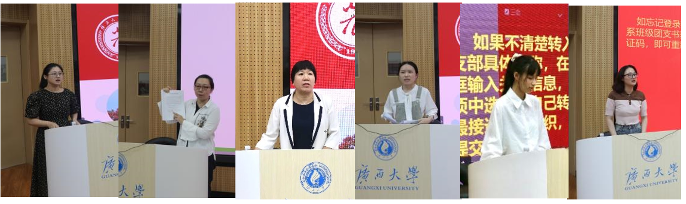 随后,团委副书记李秋实老师对就业、毕业离校等相关工作进行说明,并鼓励毕业生积极就业。宁云芬、段真珍两位老师分别就本科、研究生毕业论文存在的问题进行了讲解。针对研究生档案,段真珍老师根据注意事项进行了重点讲解。李诗老师向同学们介绍了助学贷款的申请和还款的相关事宜,提醒同学们要按时还清贷款。研究生党团建设部的赵菡同学和学生会组织部赵秋婷同学对团组织转接问题进行了演示和说明。