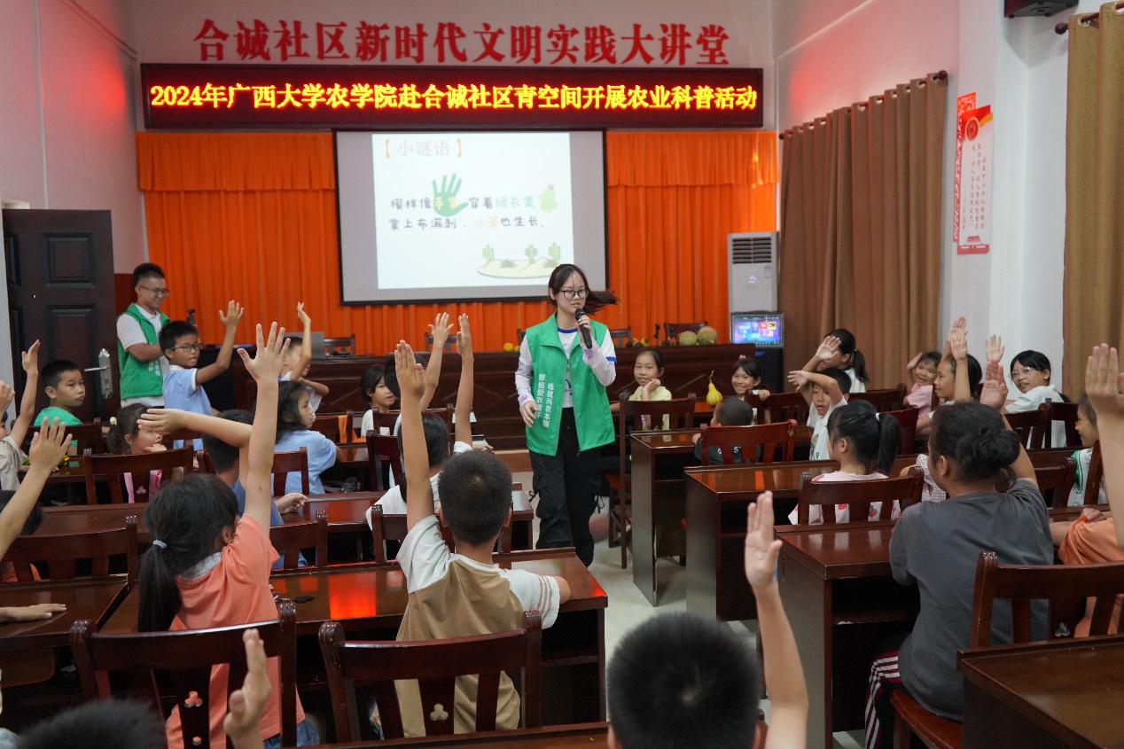 伟德国际victor1946学生乡村振兴学社来到马山县合诚社区青空间为社区的孩子们上了一堂科普教育课,通过丰富多彩的形式展开,核心内容聚焦于红色文化的传承、农业知识的普及,进一步拓展了学生的视野,引导他们对农业科学有了更浓厚的兴趣。