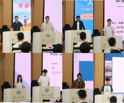 当天上午,学院在10教305教室同时举办“我的青春在西大”校友分享会。院党委副书记甘敏思、团委书记李诺、团委副书记李秋实及学工组老师们出席本次活动,分享会还特别邀请了我院优秀校友2019届农村与区域发展专业研究生李朝锋、2022届农艺与种业专业研究生黄俊豪、2023届植物保护专业本科生邓明东以及五位2024届毕业生为大家分享自己的就业、升学心历路程及宝贵经验,现场的农院学子在听了师兄师姐的分享后,纷纷表示明晰了自己的职业规划、提升了自身的求职技巧,未来将会为各行各业高质量发展贡献属于我们农院人的力量。