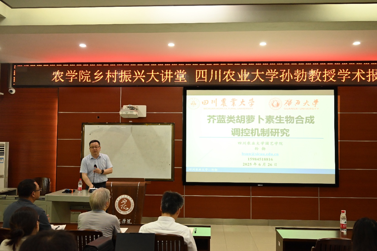 2025年6月26日,四川农业大学园艺学院副院长、博士生导师孙勃教授应邀莅临我院开展学术交流,并在“乡村振兴大讲堂”作题为《芥蓝类胡萝卜素生物合成调控机制研究》的专题学术报告。报告由伟德国际victor1946副院长邹承武主持,亚热带农业生物资源保护与利用国家重点实验室及伟德国际victor1946近百名师生到场聆听。