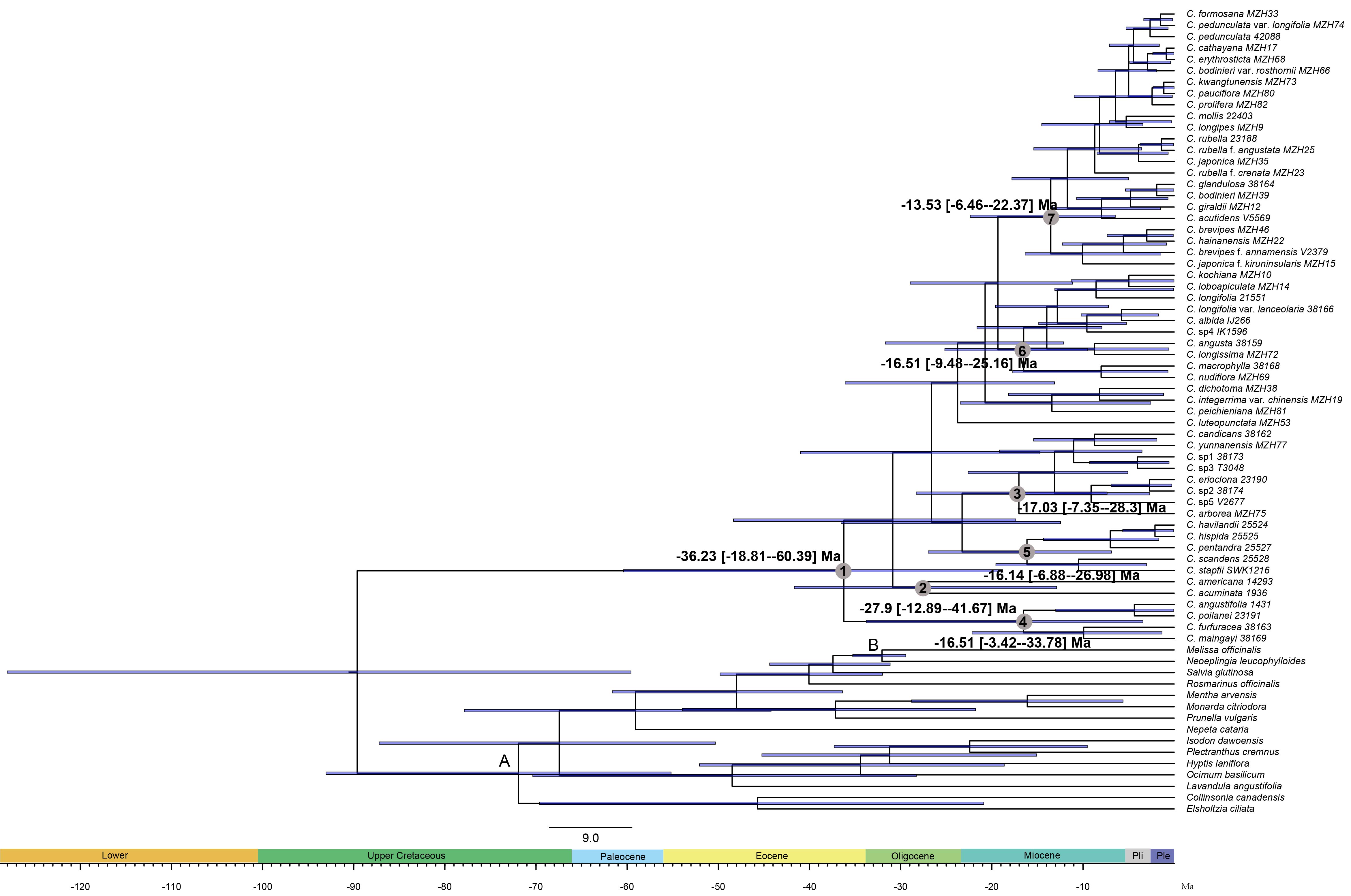 理解植物类群分布模式的形成方式一直是生物地理学领域关注的基础问题,同时分子钟和化石记录的使用为植物类群的进化引入了时间框架。其中环太平洋间隔分布模式吸引了不少研究者的兴趣与关注,且大多数研究聚焦于东亚与北美的温带植物类群。关于环太平洋热带间隔分布模式的形成,目前主要有两种支持假说:“Boreotropics”假说与“West Gondwanan vicariance”假说,此外,长距离扩散方式在跨洋间隔分布的种子植物类群研究中也得到了不少证明。唇形科紫珠属全世界约有140种,具有典型的东亚、东南亚亚洲-北美间隔分布式样,尤其在热带、亚热带区,该属的生物地理历史能否为泛热带植物类群的环太平洋间隔分布模式提供一定的参考价值?这让我们产生了兴趣。