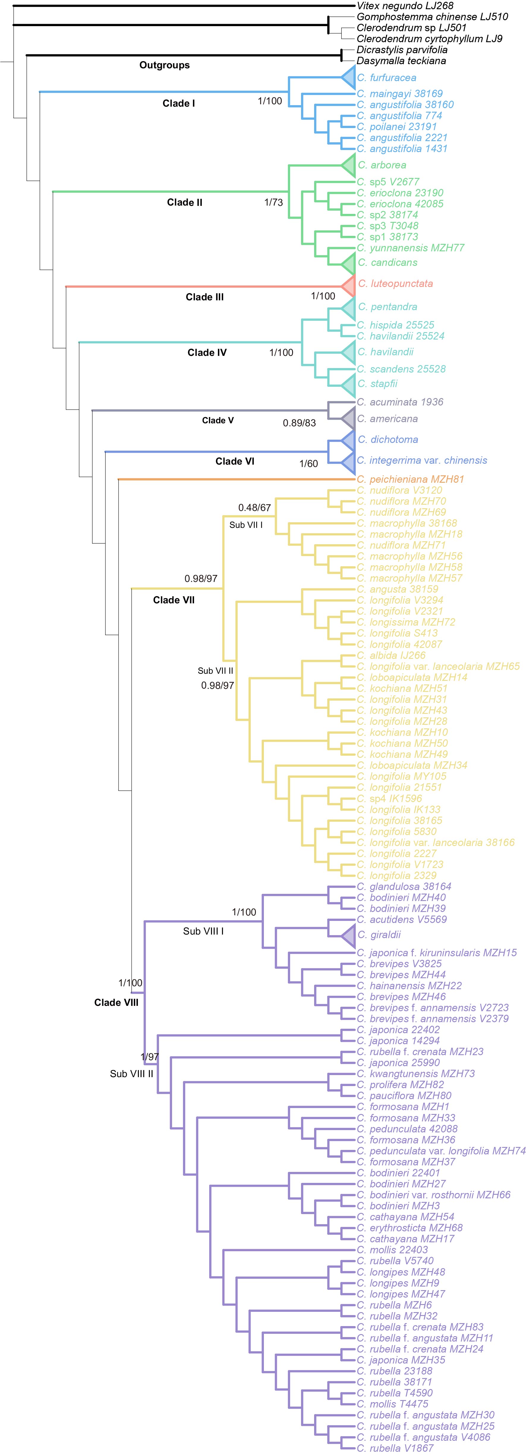 上述研究结果以“Phylogenetic relationships and biogeography of Asia Callicarpa (Lamiaceae), with consideration of a long-distance dispersal across the Pacific Ocean —insights into divergence modes of pantropical flora”为题发表于Frontiers in Plant Science第14卷(https://doi.org/10.3389/fpls.2023.1133157)。伟德国际victor1946硕士研究生蔡慧敏为论文第一作者,伟德国际victor1946马仲辉教授为通讯作者,本研究得到了国家自然科学基金(31760045, 31970220, 32260047)、广西自然科学基金(2018GXNSFAA281132)和广西甘蔗生物学重点实验室基金(GXKLSCB-202004)项目的资助。