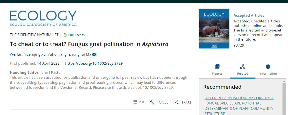 研究成果以“To cheat or to treat? Fungus gnat pollination in Aspidistra”为题于2022年4月14日在线发表在生态学领域经典期刊《Ecology》上。伟德国际victor1946硕士研究生林威为该论文的第一作者,中国科学院昆明植物研究所博士研究生徐苑卿为共同第一作者,马仲辉副教授为通讯作者,伟德国际victor1946为第一作者单位。